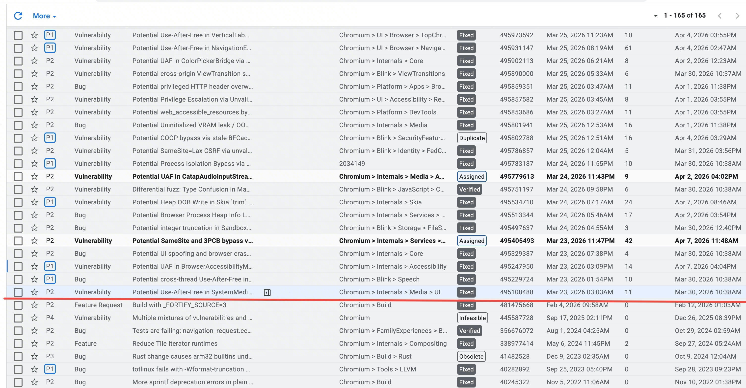 通过前五个例子可以看出它对单个模块,单个对象的安全洞察能力。那它是怎么锁定到这几个位置的呢?Chromium仓库这么大,应该不是靠暴力枚举。我们可能可以以它的漏洞列表为线索: