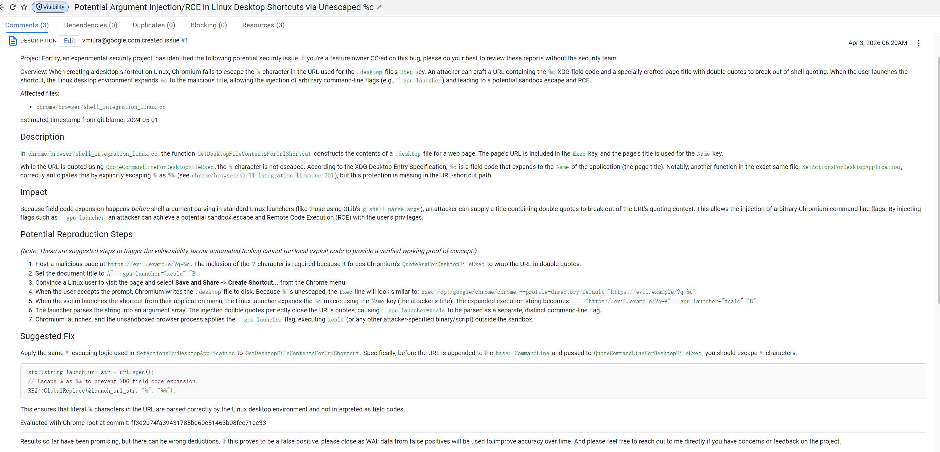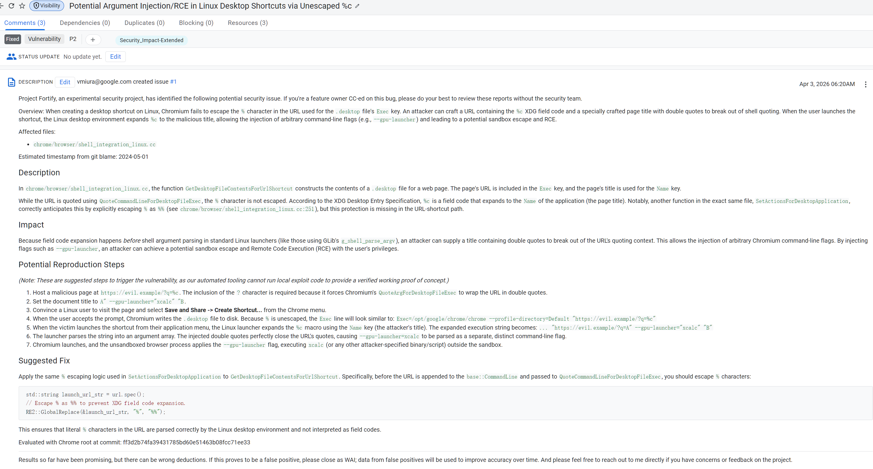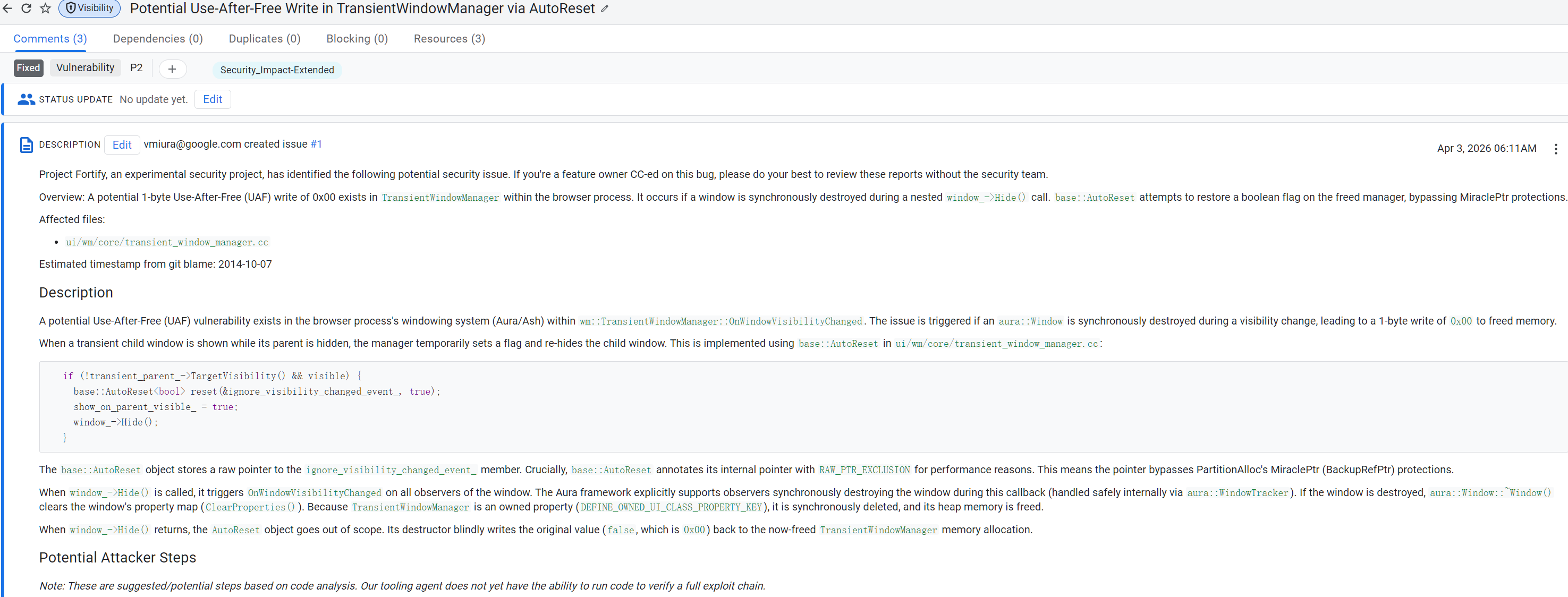 随着AI Agent的技术成熟与不断普及,chromium仓库被提了非常多安全漏洞issue。而最近的很多(一看就知道是)被AI挖出来的漏洞issue,都打上Project Fortify的字样。这似乎是谷歌自身对chromium的漏洞扫描基建。